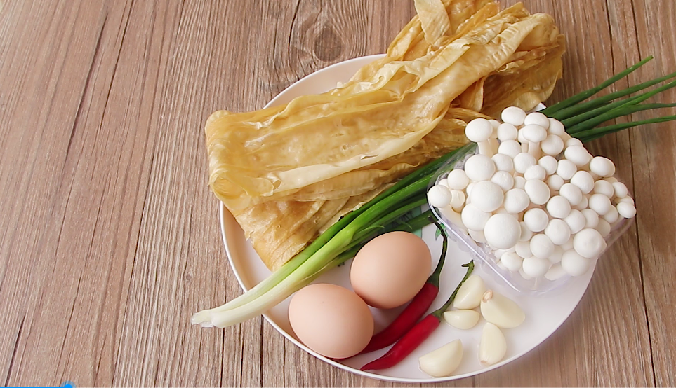 准备食材:腐竹250克,鸡蛋2个,白玉菇100克,小葱一小把,蒜米适量,小米辣适量