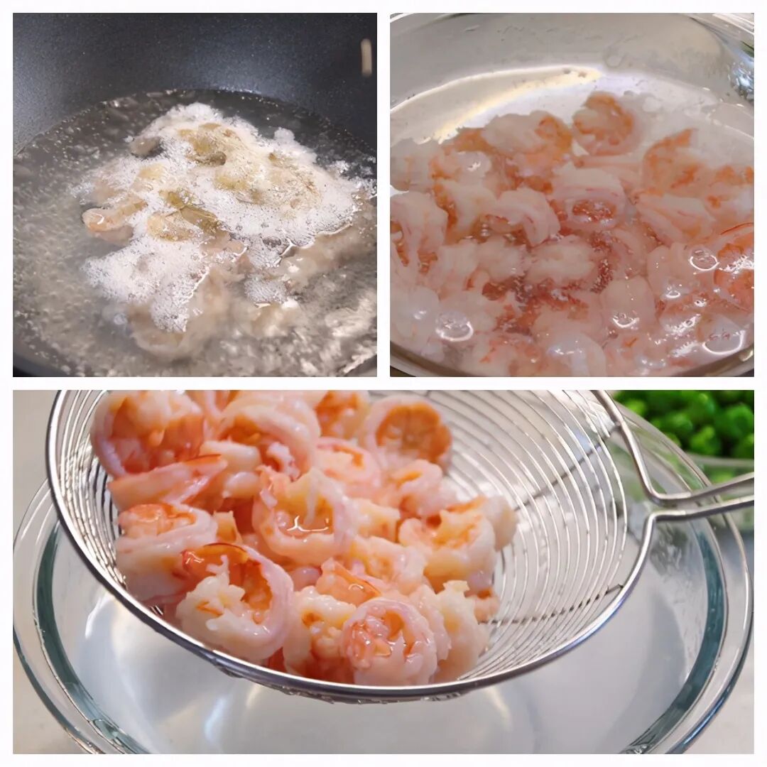 5、如果之前焯水甜豆的水干净的话,可以直接把虾仁倒入焯水,如果不是很干净那就重新装入半锅水烧开即可。把虾仁烫至肉质变红即可捞出,放入装有凉开水的碗中清洗掉虾仁表面的浮沫的同时让虾仁冷却下来,这样做的好处是保留虾仁肉质的紧实弹牙口感。