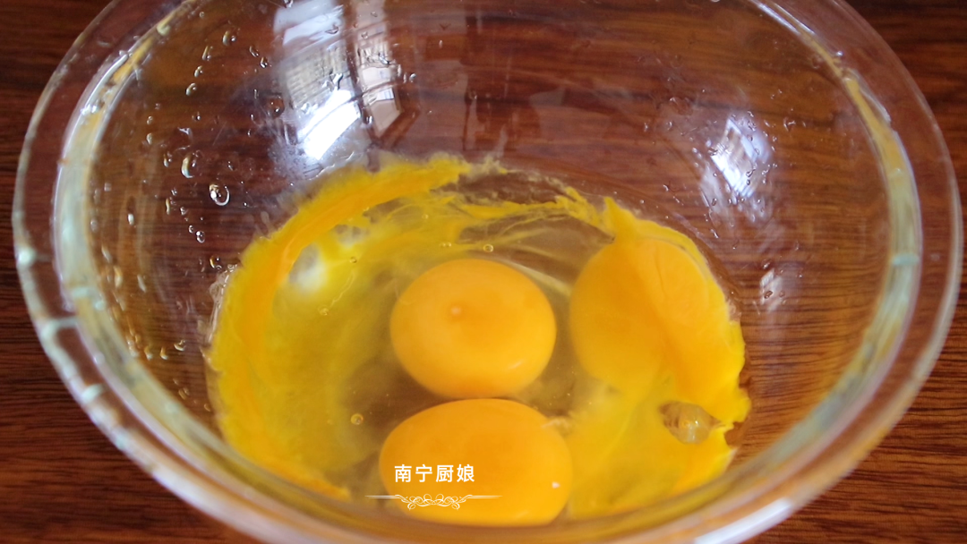 3、取一个无水无油的碗,把之前取蛋清的鸡蛋蛋黄打入碗中,再打入2个完整鸡蛋。