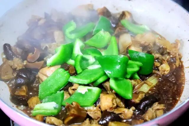 5、加盖开大火炖煮个6分钟后,开盖放入青椒块,翻炒片刻收汁即可出锅啦!香喷喷的,还没出锅就馋得不得了。