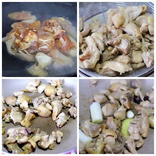 3、在锅中烧热半锅水,然后把腌制过的鸡肉倒入锅中焯水。(这里要注意的是,把鸡肉倒入锅中后,要把火给关掉,然后用水的余温来把鸡肉定型,不至于把鸡肉烫太熟,还能锁住鸡肉里的水分。)鸡肉烫到定型后,用滤网捞出沥干水分,然后开大火,把捞起的鸡肉倒入锅中,放入生姜片和大葱段一起翻炒香。