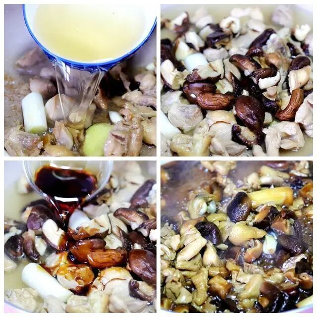 4、倒入之前泡发香菇的水,然后把香菇也倒入,倒入黄酒去腥,接着放入生抽、蚝油增鲜,再倒入老抽上色,再放入少许白糖,因为鸡肉之前腌制后,然后前面又放了生抽蚝油和老抽,所以不用额外再放入盐了。(如果家中没有孩子的话 ,可以放点啤酒,放入啤酒不仅可以起到增香去腥的作用,还能加快食材的成熟。)