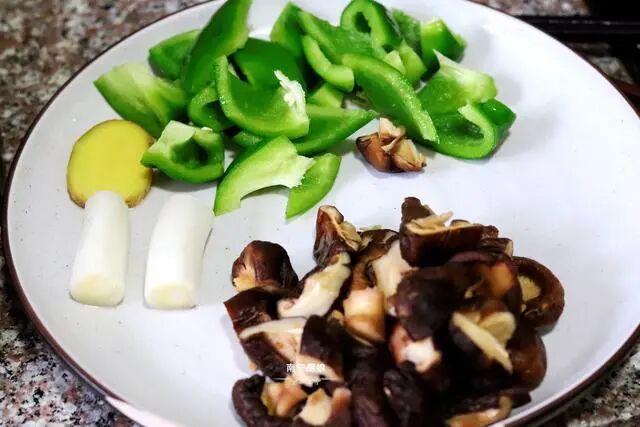 1、把青椒洗净之后切成小块,香菇泡发洗净后也切成小块,生姜切片,大葱段切段装盘待用。