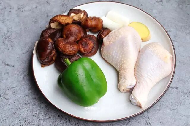 准备好这些食材:鸡腿2个、青椒1个、干香菇150克、生姜1块、大葱段2段。