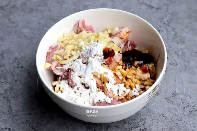 1、我们先来把排骨腌制一下,将切成小段的排骨放入一只大碗中,添加适量的食用盐、糖、蚝油、生抽、蒜沫和玉米淀粉,搅拌均匀以后腌制半个小时左右。