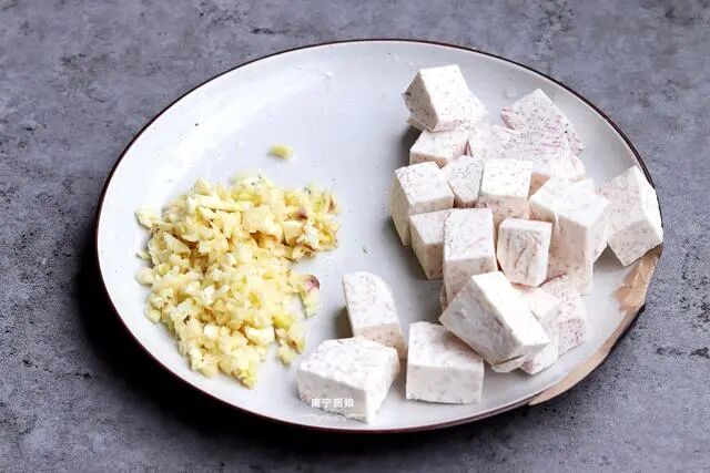 1、将芋头去掉外皮,洗净以后再切成小块状,备用。