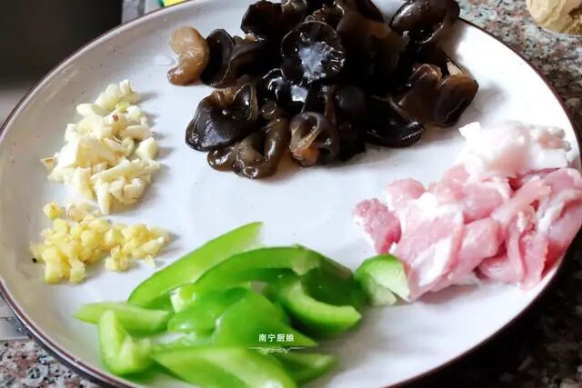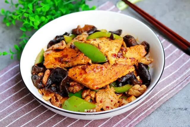 挑选一块优质的猪肉,去掉外层的皮,切成薄薄的片状;挑选一块豆腐,豆腐煎制的时候一般切成三角形状,所以用刀斜着对角切,之后再切成厚厚的片状;所需要的木耳需要用冷水提前泡发;将青椒洗净后切成小段;使用适量淀粉勾芡水淀粉备用。