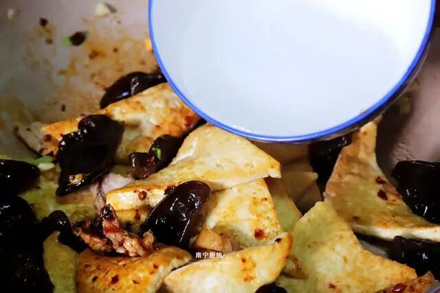 4、泡发的木耳控水之后放入锅中翻炒,放入一点清水进去。