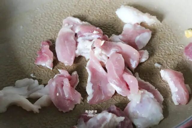 2、将切好的猪肉片放到平底锅的中间,把料酒浇在猪肉上面,用筷子搅拌搅拌,使料酒充分融入到猪肉中。