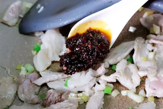 3、放一勺辣酱充分炒香后,将切好的葱姜末放进去炒香,撒上适量料酒和酱油。