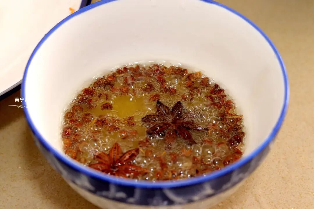 6、重起锅,在锅里倒入1勺花生油烧热,倒入装有花椒和八角、一勺食盐的碗里把香料爆香后过滤掉香料后把热油浇灌在土豆丝上。