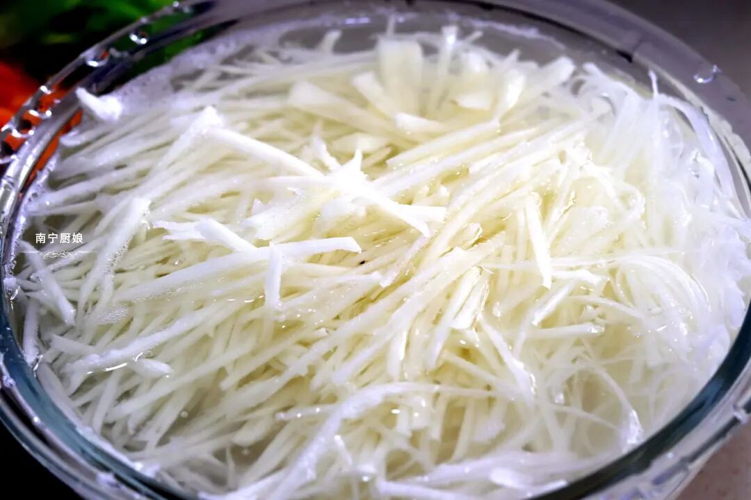 1、把土豆瓜丝后先用冷水浸泡着,防止氧化变黑了。