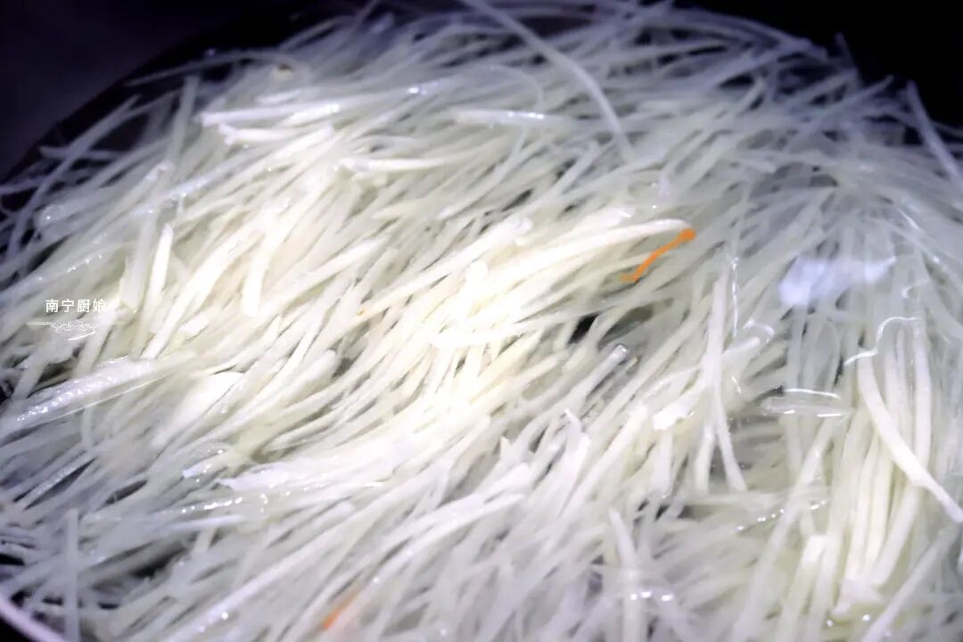 3、在锅里烧热一锅水,先把土豆丝放进去焯水,焯至呈现透明状即可捞出来沥干。