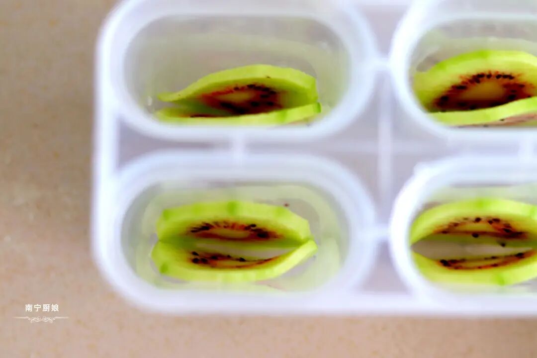 4、在冰棍模具内部贴上猕猴桃片,留有中间的空位待会好倒入果汁。