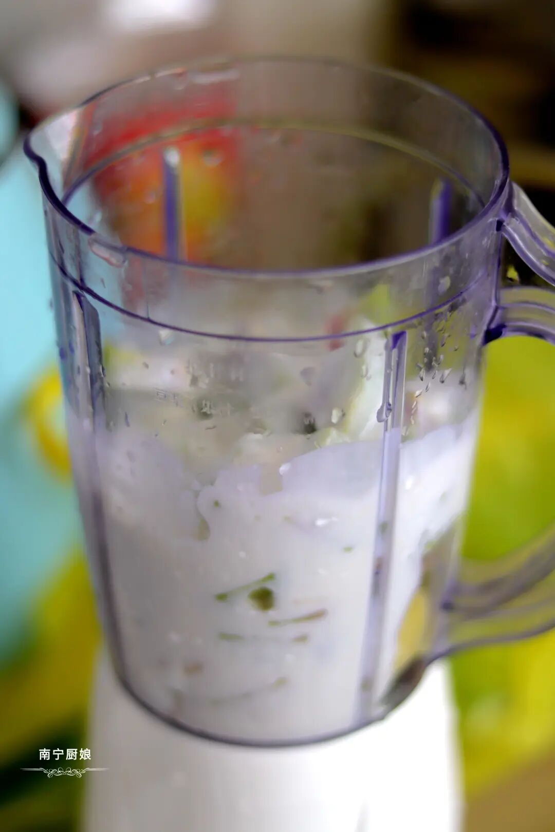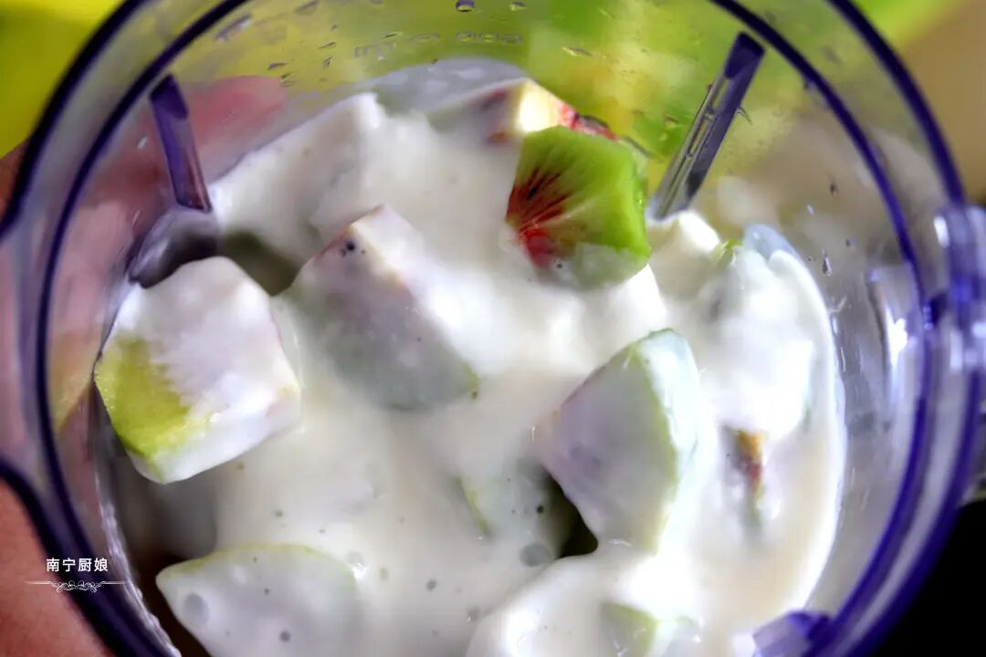 3、盖上盖子,开动电源把猕猴桃和酸奶一起搅拌成汁(有两种做法,一种是猕猴桃和酸奶一起搅拌成汁,一种是不放酸奶,单独把猕猴桃果汁加入白糖搅拌成汁)。