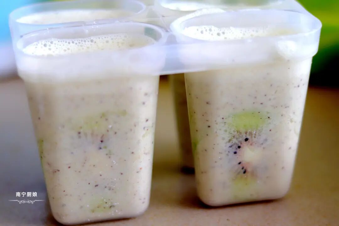 我同时做了两种口味的,以上是纯猕猴桃果汁制成的,冰棍表面还有猕猴桃切面呢,非常好看。