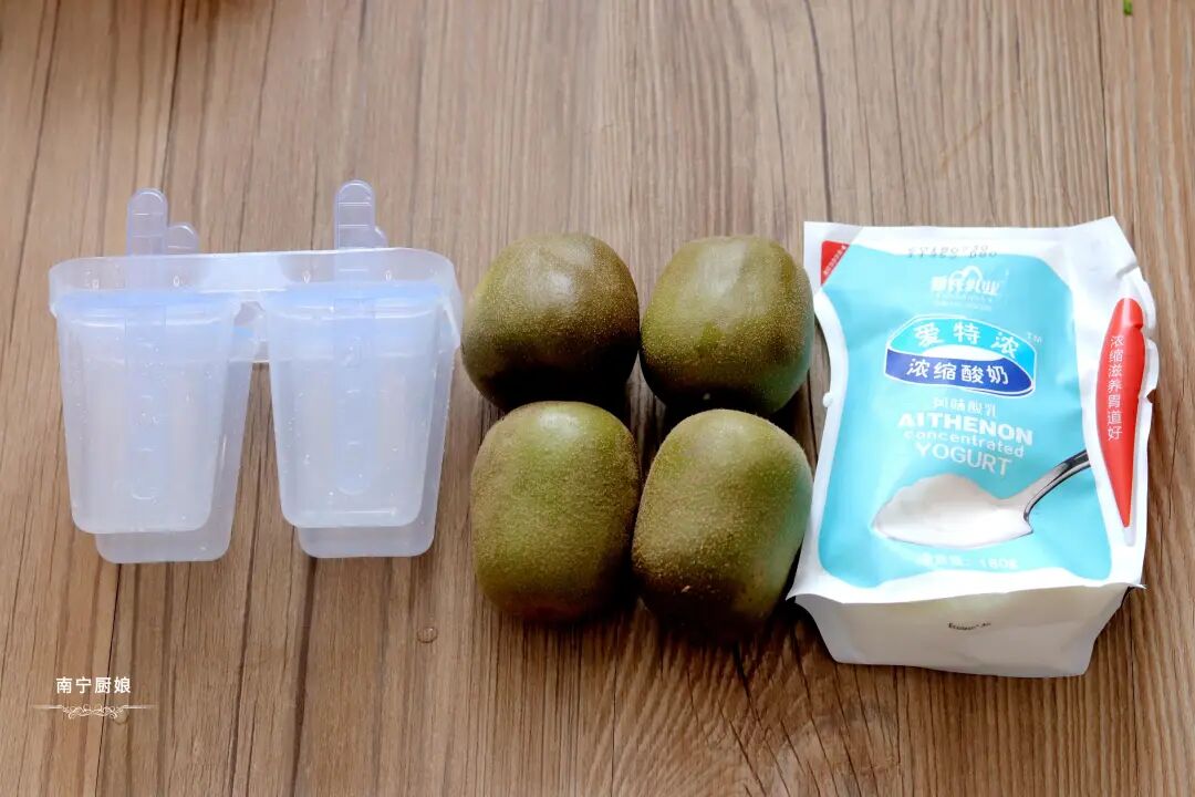 准备好食材:红心猕猴桃4颗、冰棍模具2套、酸奶1包。