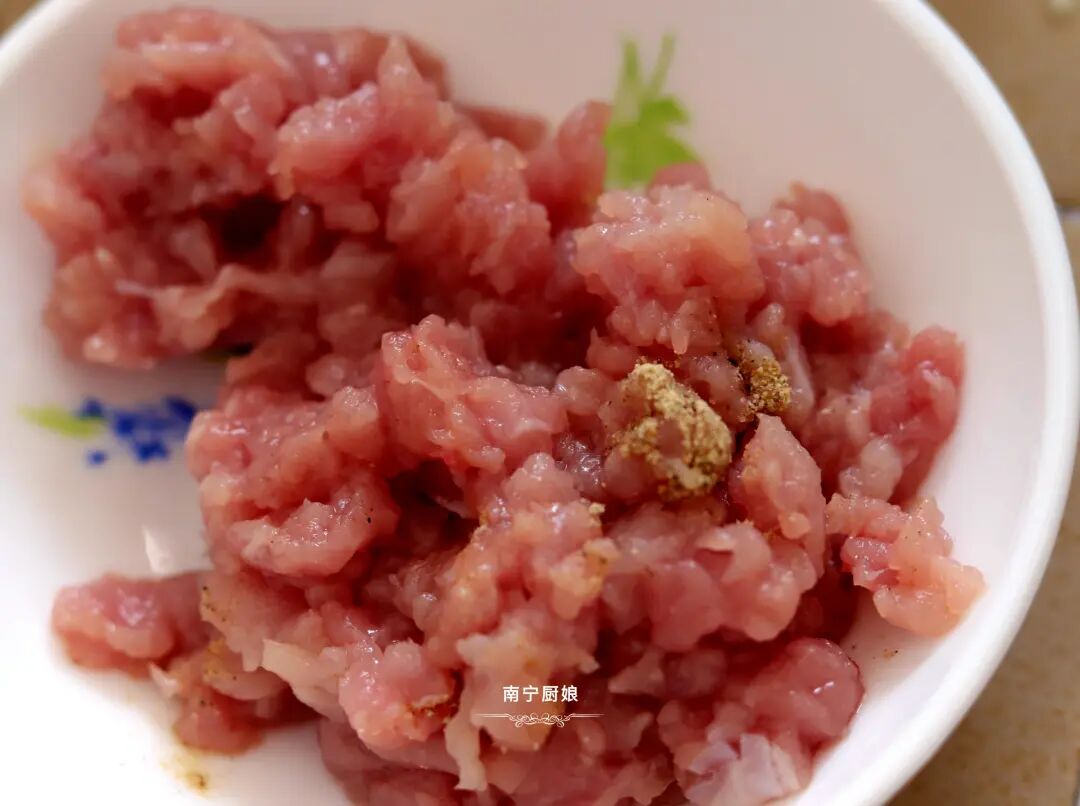 2、把猪瘦肉切碎后放入一小勺胡椒粉搅拌均匀。