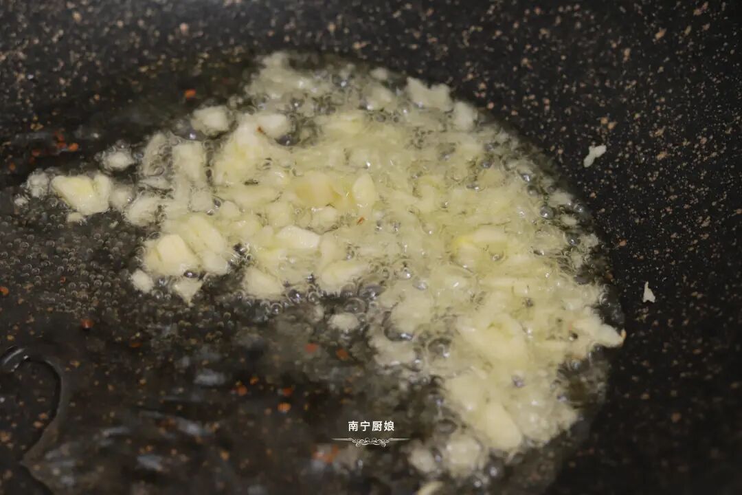 4、继续使用刚才油炸茄子的底油,烧热后把蒜米倒进去爆香。
