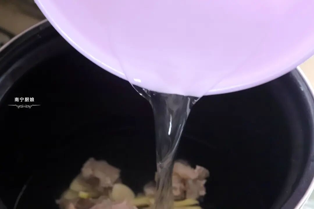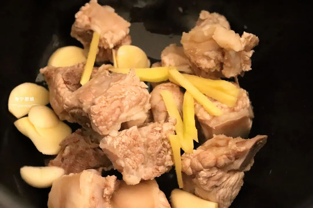 1、把排骨洗干净后放在锅里,倒入没过排骨的清水,再放入2片生姜,倒入1勺料酒。