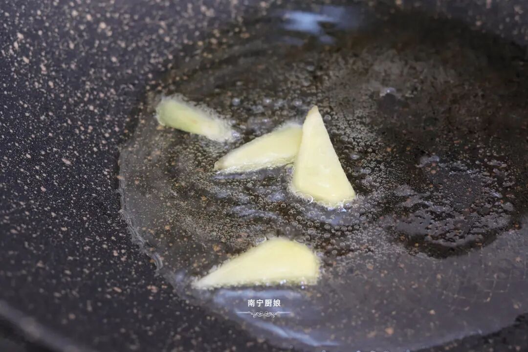 3、起锅,在锅里倒入2勺花生油,开小火烧热,把3片生姜倒进去爆香。