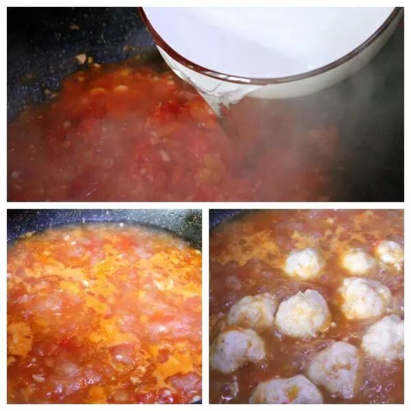 5,倒入适当开水,待开水翻滚,用勺子将拌好的虾蓉一勺一勺放入汤中,形成一个个的虾圆。