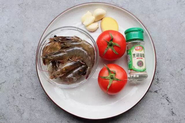 所需食材:虾、西红柿(番茄)、鸡蛋、黑胡椒、姜、蒜子、盐、油