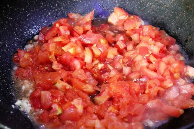 4,将切好的西红柿丁放入爆香的蒜沫中,快速翻炒,至西红柿中的番茄素释出,西红柿变软。