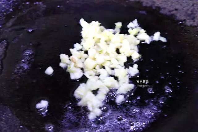 3,锅洗净,火上烧干水汽,倒入适量油,待油温适中,下入蒜沫,爆香。