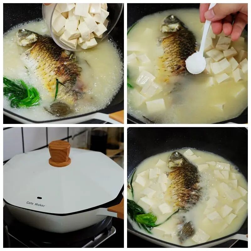 第五步:锅中的鱼汤煮至奶白色时,咱们把水豆腐倒入锅中,再翻入1勺食盐调味,盖上锅盖焖煮10分钟即可上桌。