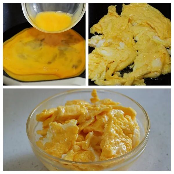 提示:在翻炒时,就可以把鸡蛋液炒成块状,但是不需要炒的太散。鸡蛋形状比较大,炒出来的菜肴才会更有食欲。