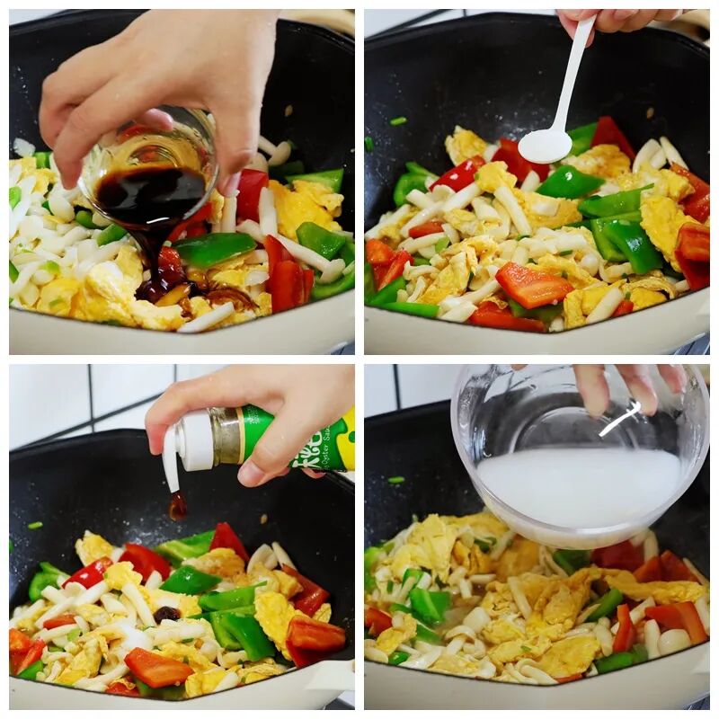 随后加入鸡精、食用盐、蚝油、生抽、白糖以及半碗水淀粉,继续翻炒,等到汤汁变得浓稠之后就可以出锅了。
