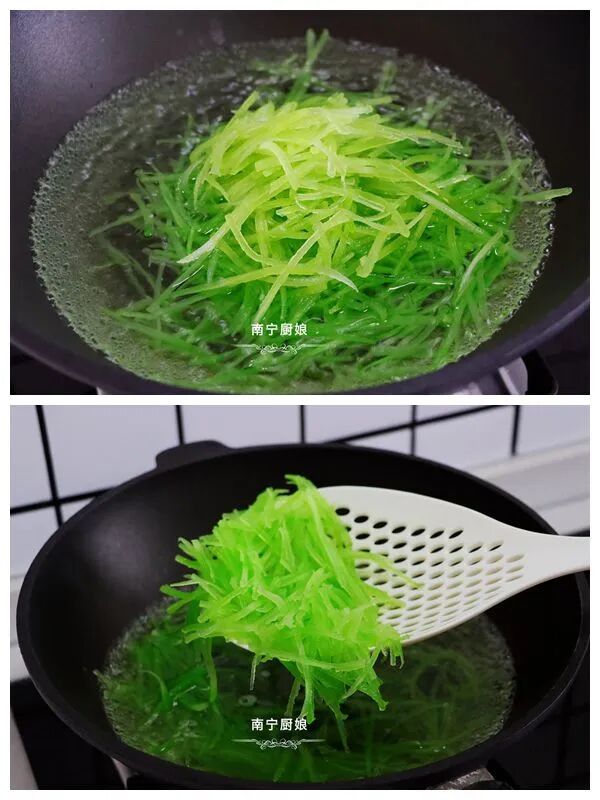 5、莴笋丝在烫的时候,不要烫过头,否则容易导致莴笋丝口感不清脆,同时使得颜色不鲜艳。