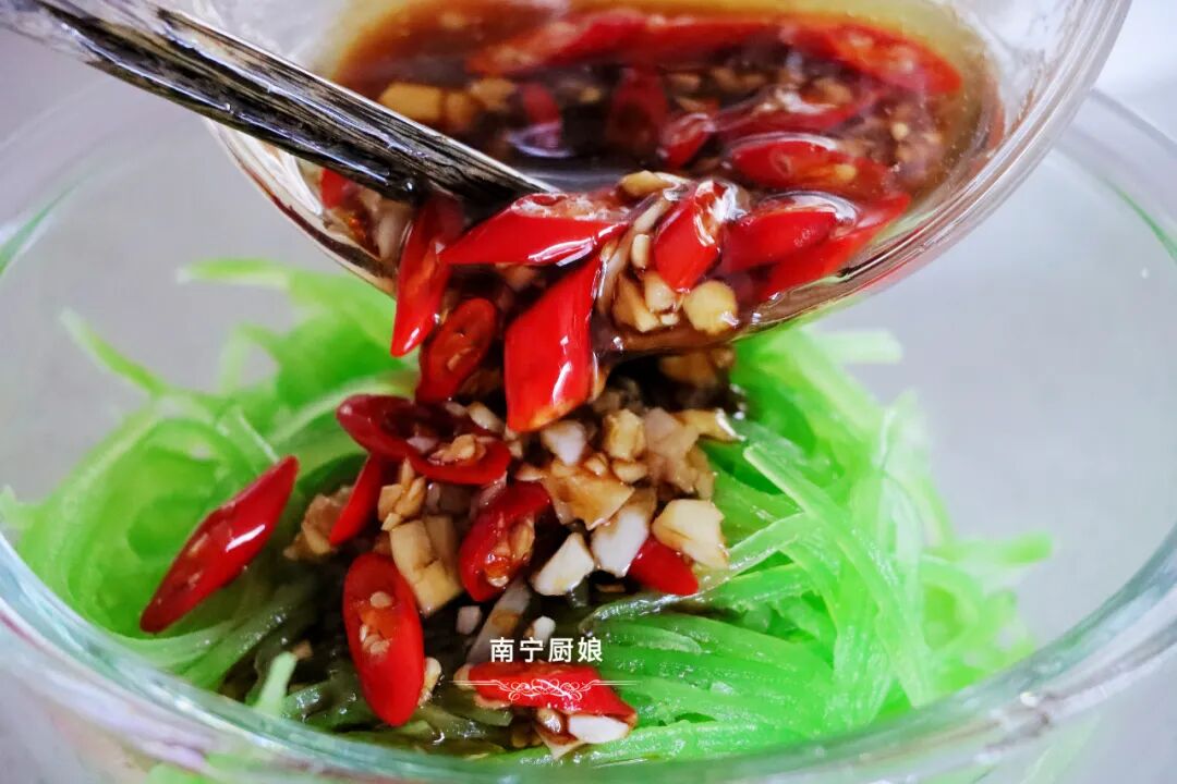 之后把酱料淋到莴笋丝上,搅拌均匀,美味的凉拌莴笋丝就做好了。