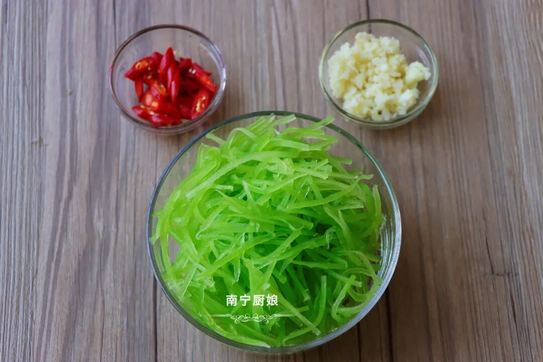 提示:如果刀工不好,莴笋丝无法切得均匀细致,那么可以使用刨丝的工具,把莴笋弄成丝状。