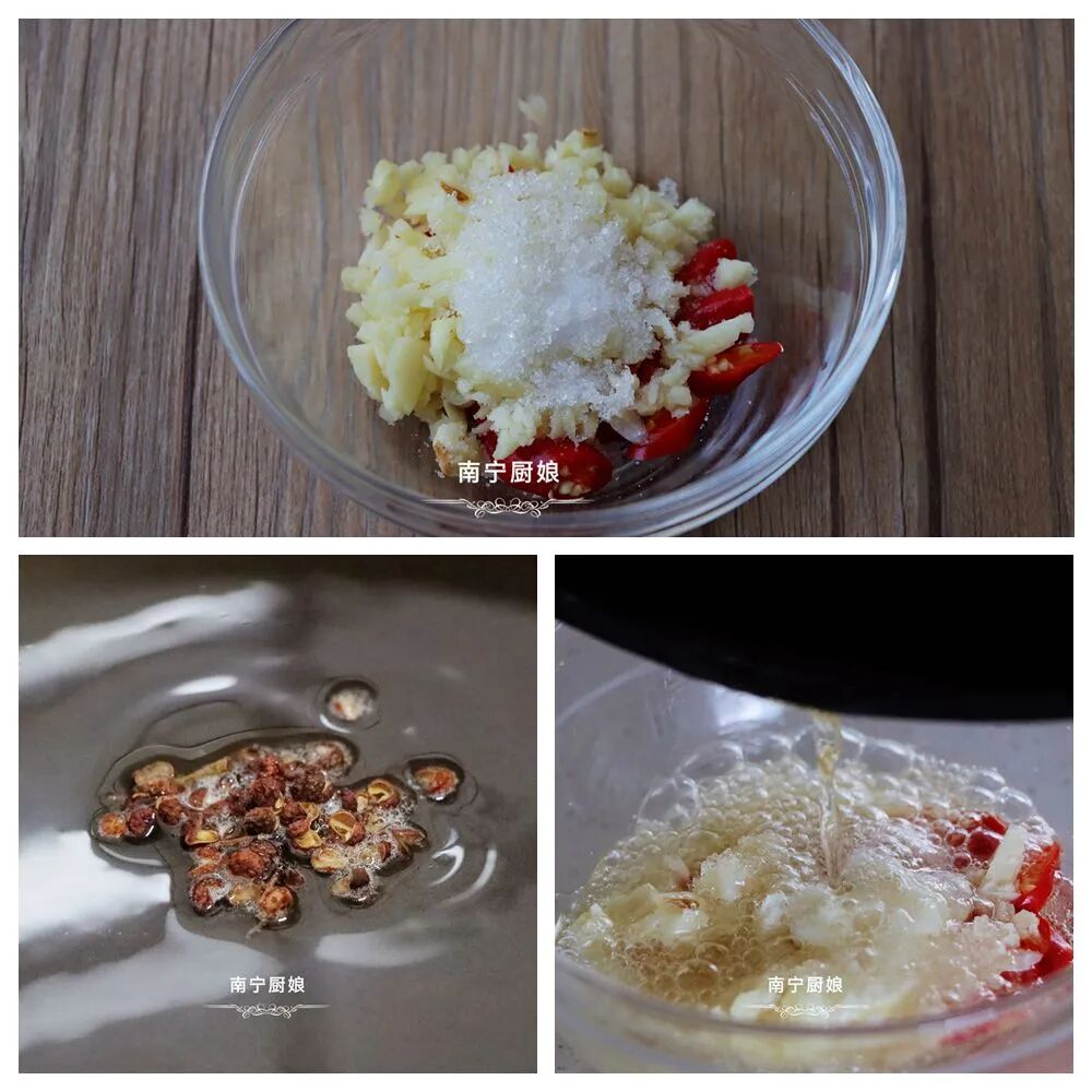第三步:将蒜瓣切成蒜末,在蒜末里加入切好的小米椒以及白醋、食用盐、白糖。