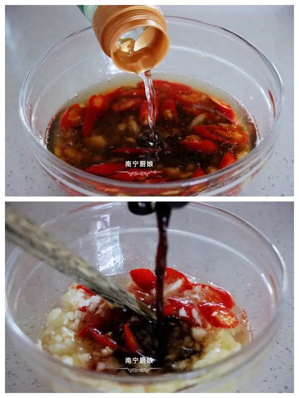 等油热之后,把热油淋在蒜泥上,随后加入适量的生抽,凉拌莴笋丝的酱料就做好了。