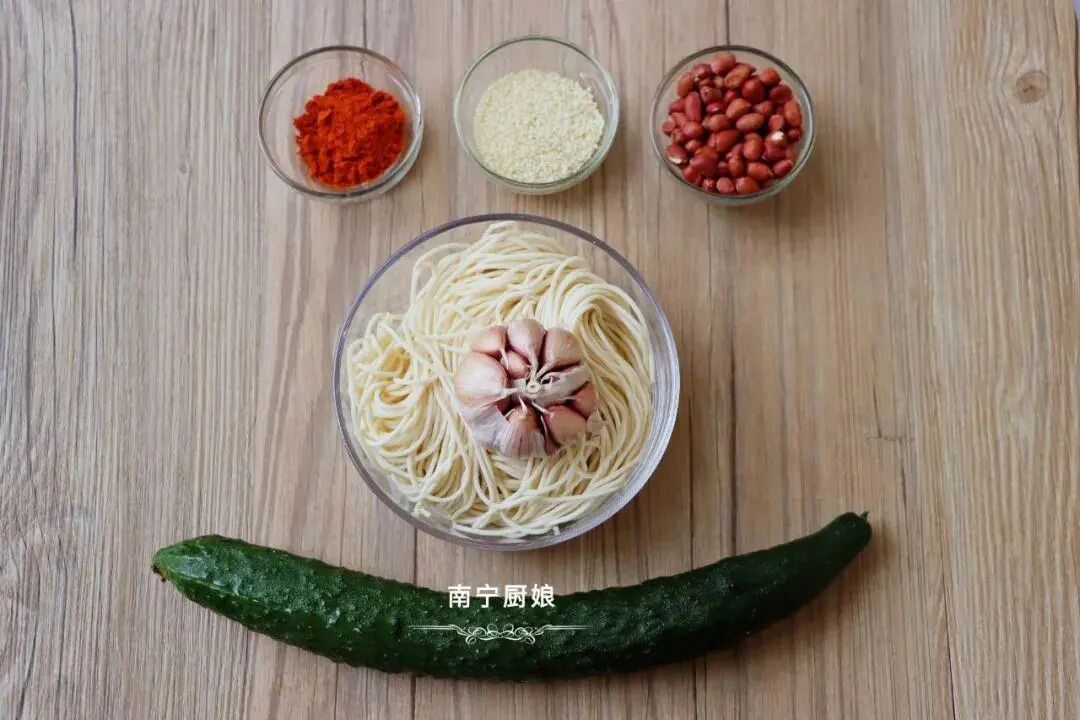 准备食材:手工面条200克、黄瓜1根、花生米100克、辣椒粉30克、大蒜1头、白芝麻5克。