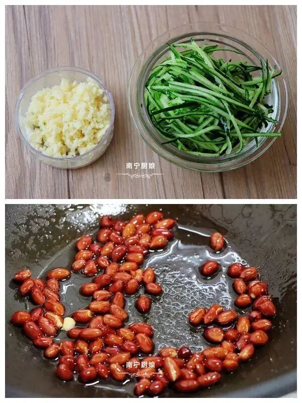 第四步:将黄瓜清洗干净之后切成丝状,然后和花生米一起放入已经变凉的面条里,再把之前做好的调料倒入碗中。
