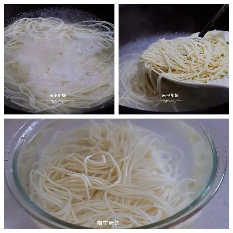 面条捞出后马上放到冷水中浸泡,给面条快速降温,同时让面条吃起来更为筋道。