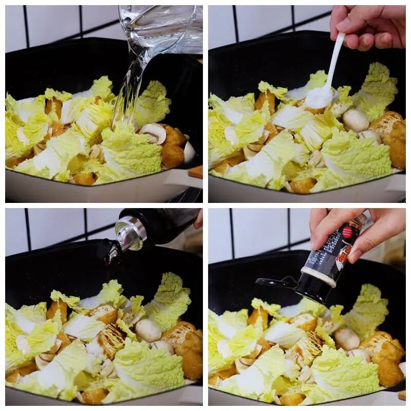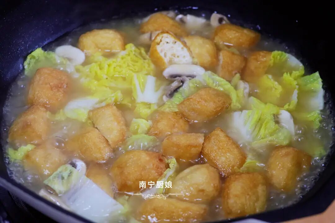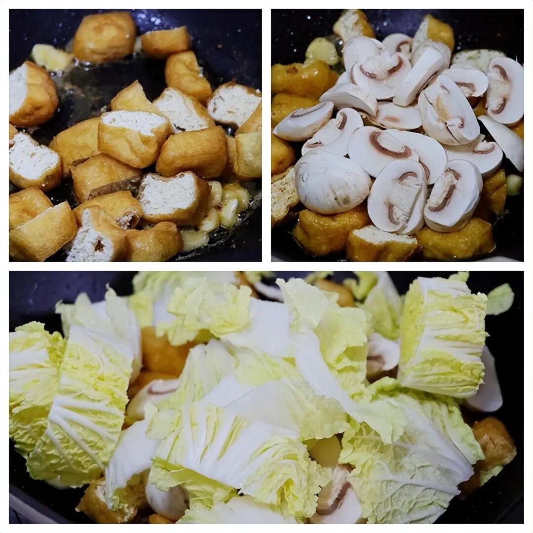第三步,加入食材和调味料。趁着虾油热乎,我们往锅中倒入大蒜,均匀翻炒,炒出蒜香味,再倒入油豆腐和口蘑、娃娃菜,再倒入没过这些食材的清水,撒下食用盐、胡椒粉,倒入生抽,再盖上锅盖,开中火煮五分钟,制作出新鲜的蔬菜锅底。