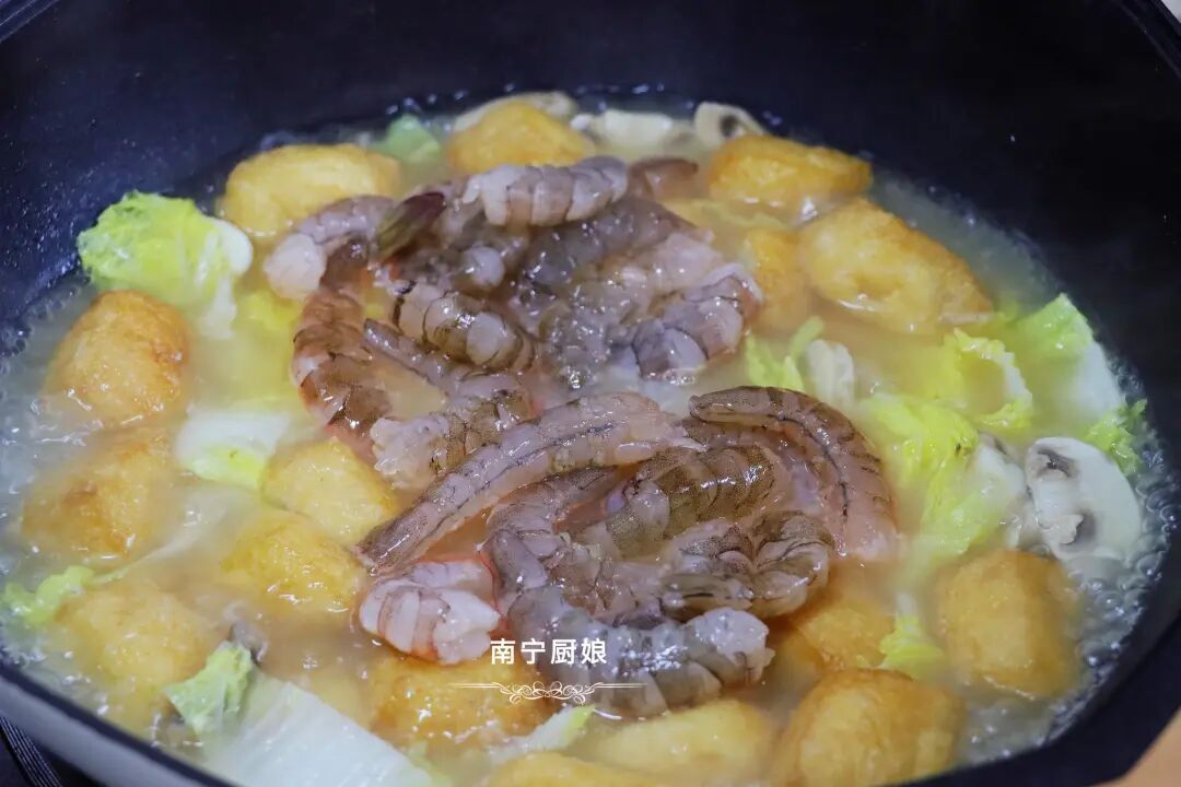 第四,焖煮出锅。五分钟后,打开锅盖,用筷子均匀搅动几下,为了防止口蘑没煮熟,可以再盖上盖子等待两分钟,接着倒入虾仁,再用筷子均匀搅动,直到虾仁变成诱人的嫩红色,再关火盛出食物。这时,我们再根据口味撒入葱花,一道热气腾腾、香味扑鼻的白菜油豆腐虾煲就做好了!