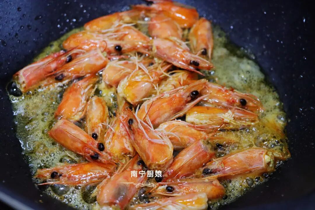 第二步,煎出虾油。开中火烧锅,锅面烧干后倒入适量的食用油,油烧热后,慢慢倒入虾头。刚入锅的虾头有一点儿水分,会跟热油起反应,所以大家注意不要被热油溅到。我们将中火转成中小火,将虾头煎红,煎出新鲜的虾油,然后用筷子将虾头夹出来,锅中只留下虾油。
