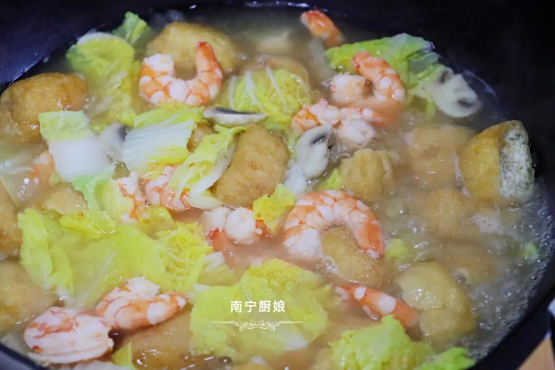 荤素搭配的白菜油豆腐虾煲,低脂营养、鲜香美味,是一道适合全家人食用的好菜!新鲜的白菜煮得透亮,吃起来健康又美味;热乎乎的油豆腐裹满了汤汁,口感极佳;低脂的口蘑含有大量植物纤维,嚼劲十足又鲜美异常;再加上肉质紧实的虾仁,咬一口都是令人心动的好味道!
