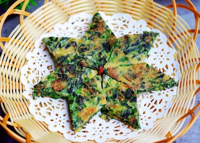6、起锅烧油,晃动锅身,使锅底都能够沾上油。将之前的鸡蛋、面粉以及菠菜碎等混合的糊倒入锅中,开中小火即可,煎制时要适时地翻面确保面糊熟透,可利用筷子、勺子等辅助锅铲翻面,小心不要烫伤自己的手。
