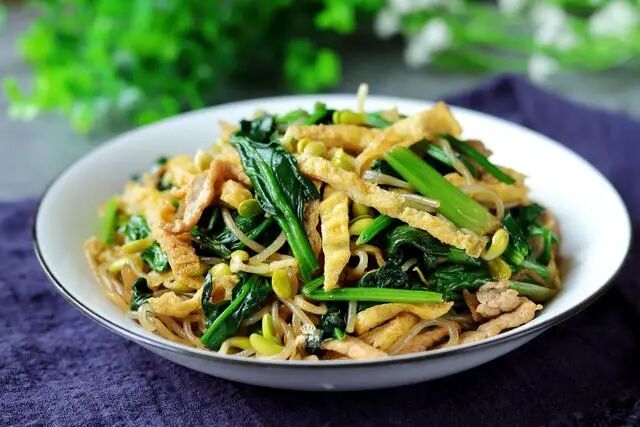 1、菠菜清洗干净后分为菜茎和菜叶切段;鸡蛋在碗中放入适量食盐打散,然后小火热锅倒入油烧热,把鸡蛋液倒入煎至凝固,把鸡蛋切成丝装碗待用;红薯粉倒入热水泡软捞出沥干水分待用;豆芽焯水约1分钟捞出沥干水分待用。