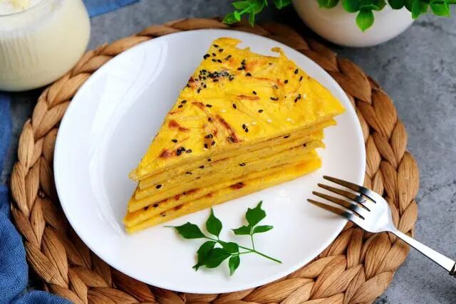 7、将另一碗蛋液均匀地淋在面糊上,继续煎制,仍然要注意适时地翻面,等到两面呈现出金黄色时就可以出锅装盘了。