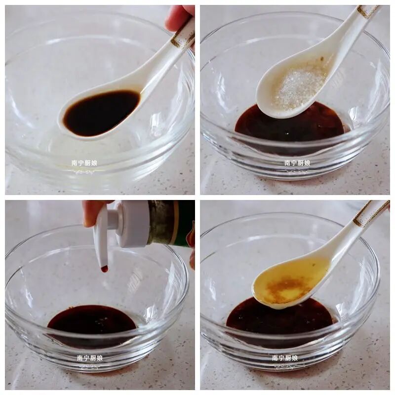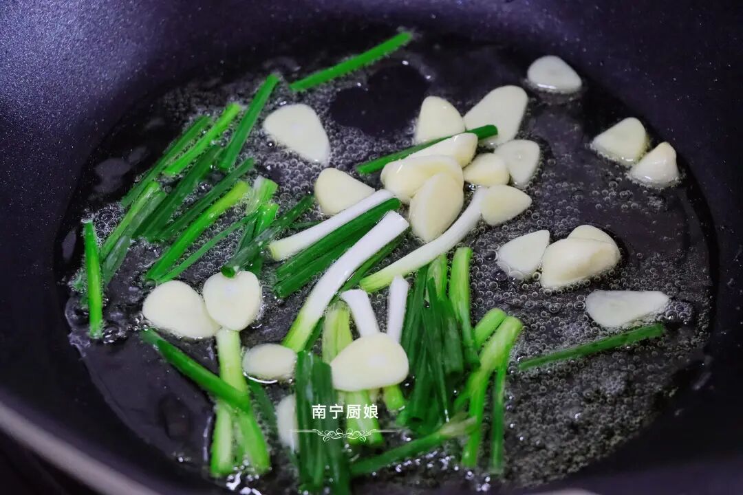 第三步,调制酱料。往锅中倒入油茶,开中火烧油,油烧开后放一半葱段、姜片和蒜片,另一半留出来,然后不断煸炒葱段、姜片和蒜片,直到炒出香味来,炒成香喷喷的热油,再将这些炒得微焦的葱段、姜片和蒜片捞出来。然后准备一个小碗,倒入适量的生抽、蚝油、白糖,再将锅中热油浇上去,调制成酱料。