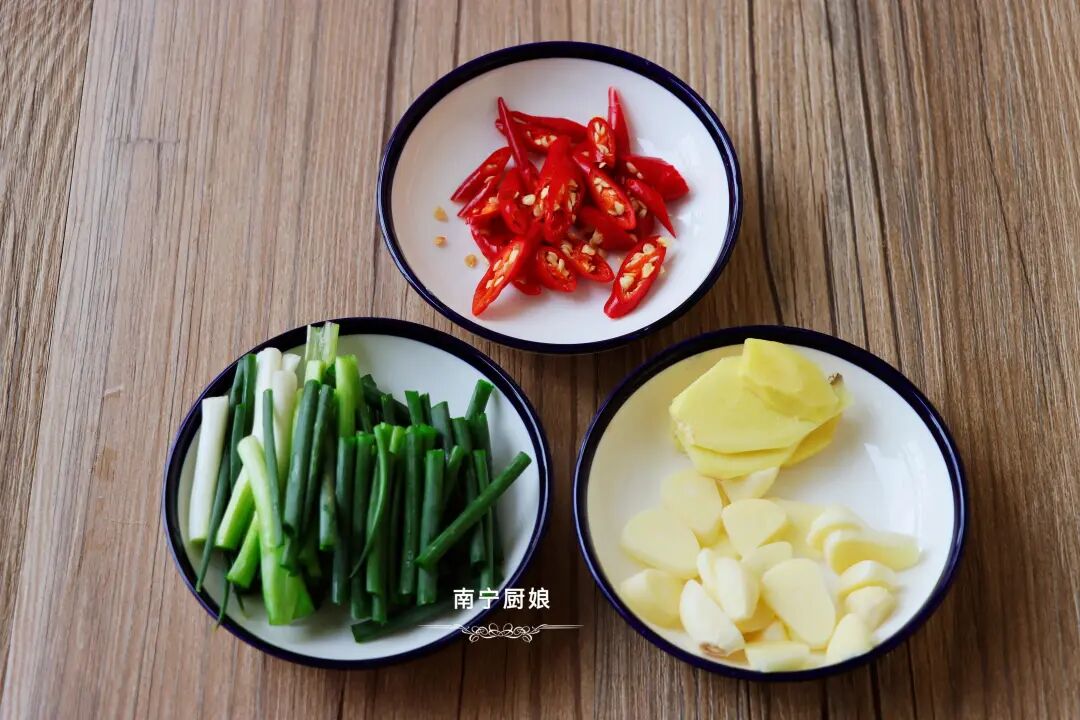第二步,处理其他食材。我们在等蛏子吐沙的时候,将小葱、生姜和大蒜、小米辣清洗干净,小葱切成葱段、生姜切成姜片、大蒜切成蒜片、小米辣切斜段装盘备用,小葱另外切一点儿葱花备用。