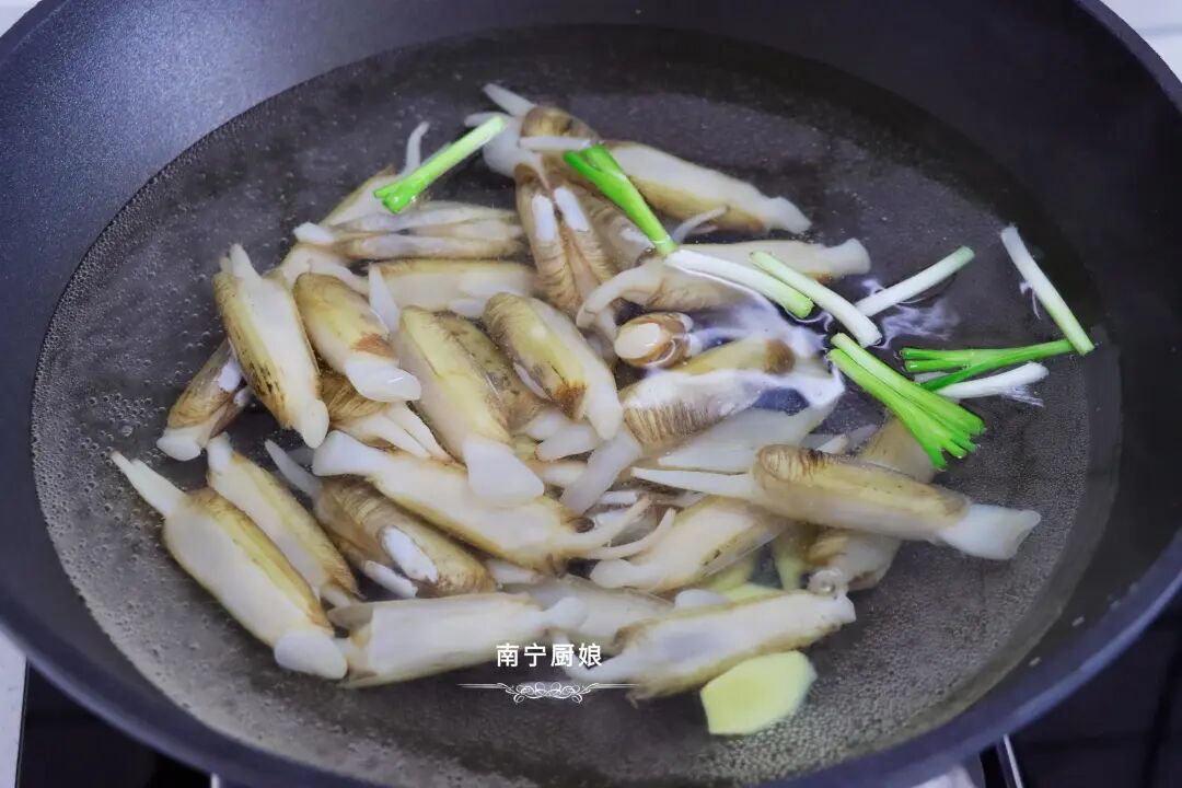 第四步,水煮蛏子。一锅清水开中火烧煮,倒入另一半葱段、姜片和蒜片,等到水煮开了,将已经吐完沙的蛏子倒入锅中,等待蛏子煮熟。
